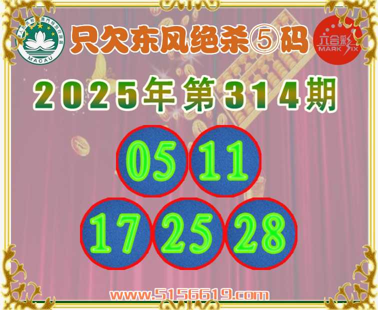 314期:〖只欠东风〗 ✌️绝杀⑤码✌️【05.11.17.25.28】开:羊23准上榜高手